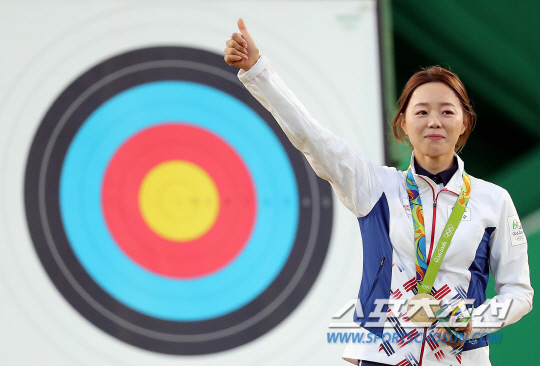 양궁대표팀 장혜진 선수가 11일 오후(현지시간) 브라질 리우데자네이루 마라카낭 삼보드로무 양궁장에서 열린 2016 리우올림픽 양궁 여자 개인전 시상식에서 엄지를 들어 보이고 있다. /2016.8.11/리우데자네이루=올림픽사진공동취재단 k