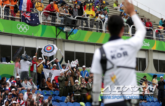 남자양궁 구본찬이 12일 오전(현지시간) 브라질 리우데자네이루 마라카낭 삼보드로무 양궁장에서 열린 2016 리우 올림픽 양궁 남자 개인전 16강전에서 승리한 뒤 응원단을 향해 손을 흔들고 있다./2016.8.11/리우데자네이루=올림픽사진공동취재단H