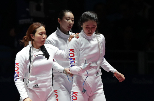 최인정이 11일 오전(현지시간) 브라질 리우데자네이루 바하 올림픽파크 카리오카 경기장에서 열린 펜싱 여자 에페 단체전 8강에서 마지막 주자로 나서 에스토니아 선수에게 패하자 신아람, 강영미가 다독이고 있다. 한국은 펜싱 여자 에페 단체 4강 진출에 실패했다./2016.8.11/리우데자네이루=올림픽사진공동취재단H