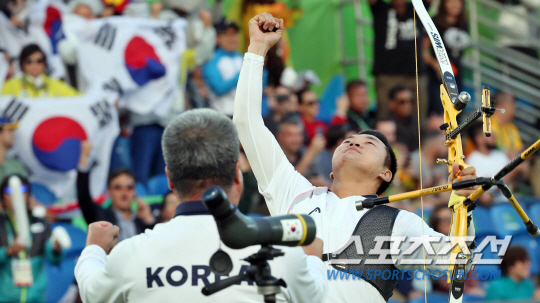 남자 양궁 구본찬 선수가 12일 오후(현지시간) 브라질 리우 마라카낭 삼보드로무 양궁경기장에서 열린 결승전에서 프랑스 장 샤를 발라동 선수를 꺽고 금메달을 차지했다.구본찬 선수가 우승순간 환호하고 있다./2016.8.12./리우데자네이루=올림픽사진공동취재단