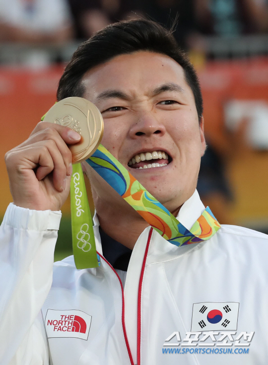 12일 오후 (현지시간) 브라질 리우 마라카낭 삼보드로무 양궁경기장에서 열린 2016리우올림픽 남자 양궁개인전 결승전에서 금메달을 획득한 구본찬 선수가 메달을 들고 환하게 웃고있다. 2016.8.12 / 리우데자네이루=올림픽사진공동취재단G
