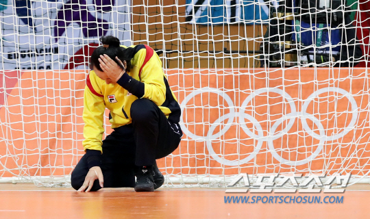 여자핸드볼 오영란 골키퍼가 12일 오후(현지시간) 브라질 리우데자네이루 바하 퓨처아레나에서 열린 여자 핸드볼 조별리그 B조 4차전 프랑스와 경기에 무릎을 꿇고 앉아 있다. /2016.8.12./리우데자네이루=올림픽사진공동취재단 P