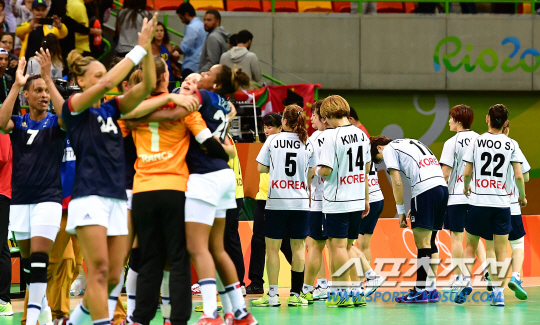 한국 여자 핸드볼팀이 12일 오후(현지시간) 브라질 리우데자네이루 바하 퓨처아레나에서 열린 여자 핸드볼 조별리그 B조 4차전 프랑스와 경기에 17-21로 패해 8강 진출에 실패했다. 한국선수들이 아쉬운 표정으로 관중석에 인사 하고 있다. /2016.8.12./리우데자네이루=올림픽사진공동취재단 P