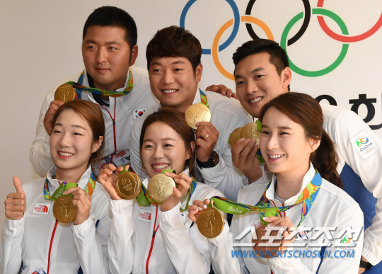 2016리우 올림픽에서 양궁 전종목을 석권한 대한민국 양궁대표팀이 13일 오전(현지시간) 브라질 리우데자네이루 바하 코리아하우스에서 기자회견을 가졌다. 기자회견을 마친뒤 선수들이 기념촬영을 하고 있다./2016.08.13/리우데자네이루=올림픽사진공동취재단A