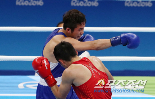 한국복싱대표 함상명이 14일 오후(현지시간) 브라질 리우데자네이루 리우센트로 파빌리온6에서 열린 2016 리우올림픽 복싱 남자 밴텀급 56kg 16강전을 치르고 있다. 함상명은 중국의 장지아웨이에게 부심 판정 0-3(27-30, 27-30, 27-30)으로 패했다.2016.8.14.,/리우데자네이루=올림픽사진공동취재단F
