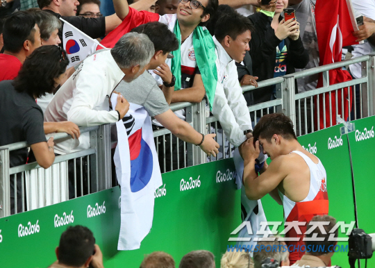 김현우 선수가 14일 오후(현지시간) 브라질 리우데자네이루 올림픽파크 카리오카 아레나2에서 열린 레슬링 그레코로만형 75kg급에서 크로아티아 보조 스타세비치를 누르고 동메달을 따냈다. 김현우 선수 경기가 끝난뒤 예선에서 퇴장당했던 박치호 코치를 찾아가 울고 있다./2016.8.14/리우데자네이루=올림픽사진공동취재단A