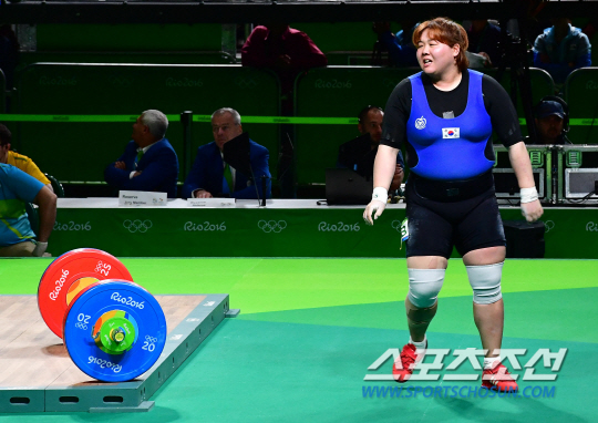 역도 여자 75kg 이상 경기가 14일 오후(현지시간) 브라질 리우데자네이루 리우센트루 파빌리온2 경기장에서 열린 가운데 한국 손영희 선수가 용상 2차시기에 실패하며 아쉬워 하고 있다. /2016.8.14/ 리우데자네이루=올림픽사진공동취재단 P