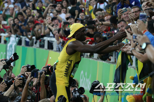 14일 오후(현지시간) 리우데자네이루 마라카낭 올림픽 주 경기장에서 열린 남자 100m 결승에서 우사인 볼트가 우승을 차지했다. 우사인 볼트는 최초로 100m 육상에서 3연패를 달성했다. 볼트가 관중과 악수를 하고 있다./2016.8.14/리우데자네이루=올림픽사진공동취재단 D