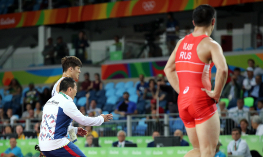 김현우 선수가 14일 오전(현지시간) 브라질 리우데자네이루 올림픽파크 카리오카 아레나2에서 열린 레슬링 그레코로만형 75kg급 예선경기에서 러시아 로만 블라소프에게 편파판정으로 패, 안한봉 감독이 항의를 하고 있다./2016.8.14/리우데자네이루=올림픽사진공동취재단 k