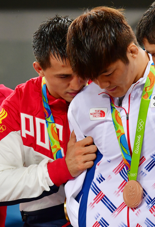 14일 오후(현지시간) 브라질 바하 리우데자네이루의 카리오카 아레나 2에서 열린 '2016 리우 올림픽' 남자 레슬링 그레코로만형 75kg급 시상식에서 석연찮은 판정으로 금메달을 차지한 러시아에 로만 블라소프가 동메달을 차지한 김현우에게 미안한듯한 행동을 보이고 있다. 2016.8.14/리우데자네이루=올림픽사진공동취재단E
