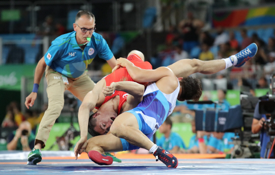 14일(한국시각) 브라질 리우의 카리오카 아레나2에서 열린 김현우(28·삼성생명)와 로만 블라소프(러시아)의 2016년 리우올림픽 레슬링 남자 그레코로만형 75kg급 16강전.