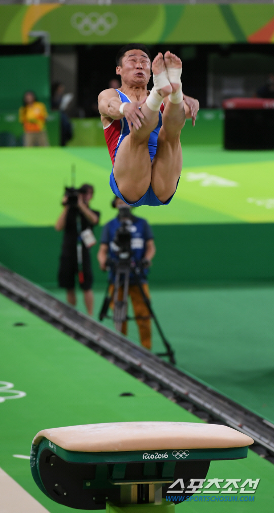 북한 체조대표팀의 리세광이 15일 오후(현지시간) 브라질 리우데자네이루 올림픽 체조경기장에서 열린 남자개인 도마 결승전에서 연기를 펼치고 있다. /2016.8.15/리우데자네이루=올림픽사진공동취재단 C