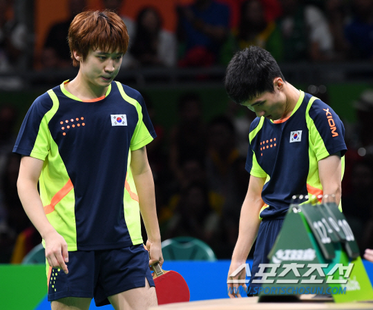 15일 오후(현지시간) 브라질 리우데자네이루 바하 리오센트로 파빌리온 3경기장에서 열린 탁구 남자 단체전 준결승전 한국과 중국의 경기에서 정영식과 이상수가 장지커, 쉬신과 3복식에서 만났다. 2세트를 내준 후 아쉬워하는 정영식과 이상수의 모습./2016.08.15/리우데자네이루=올림픽사진공동취재단 N