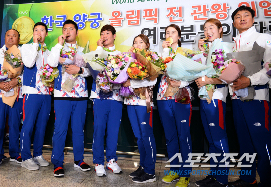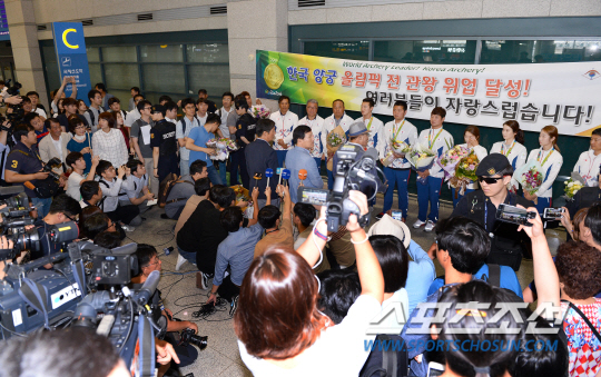 사상 첫 올림픽 단일대회 전종목 석권에 빛나는 양궁대표팀이 16일 인천공항을 통해 귀국했다. 인천공항은 대표팀이 도착하기 전부터 들썩이기 시작해 이내 용광로처럼 달아올랐다. 200여명의 취재진, 50여대의 방송ENG카메라, 200여명의 양궁관계자 및 가족들, 일반팬들까지 더해졌다. 선수들의 표정은 밝았고, 모인 이들은 우레와 같은 박수로 이들을 맞았다.