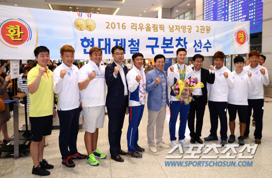 이날 구본찬을 축하해주기 위해 인천공항을 찾은 현대제철 양궁단 팀 선배 오진혁(35)은 "양궁이 원래 그렇다"고 했다. 오진혁은 2012년 런던올림픽 개인전 금메달(단체전 동메달) 주인공이다. 2014년 인천아시안게임 개인전에서도 금메달을 땄다. 남자 양궁 세계랭킹 1위였던 최고선수다. 그는 리우에 가지 못했다. 대표 선발전에서 탈락했다. 오진혁은 "예천에서 열린 대표 선발전에서 딱 한발 실수를 했다. 8점을 쏴도 되는데 7점을 쐈다. 결국 슛오프에 들어가 졌다. 이후부터 계속 잘 안 풀렸다"고 했다. 오진혁은 "기존 국가대표에게 동점일 경우 플러스 점수를 주는 경우는 있어도 특혜는 아예 없다. 무조건 활을 더 잘쏴야 국가대표가 될 수 있다"고 말했다. 실력이 비슷한 선수들이 즐비하고, 치열하게 경쟁하다보니 올림픽 금메달리스트라고 해도 세명이 출전하는 다음 올림픽에 나갈 수 있다는 장담을 못한다. 오진혁은 "(구)본찬이가 금메달 딸때는 내가 금메달을 따는 것처럼 기뻤다. 대견했다. 아슬아슬하게 올라가서 큰 일을 해냈다. 또 단체전 금메달은 런던에서도 이루지 못한 쾌거다. 후배들이 참 자랑스럽다. 다음 도쿄올림픽 때는 나 역시 다시한번 영광된 자리에 서고 싶다"고 했다.