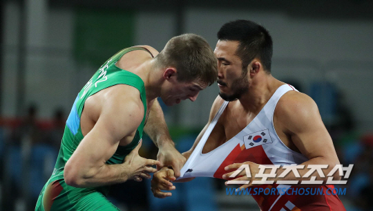 한국 레슬링 대표 류한수가 16일 오전(현지시간) 브라질 리우데자네이루 바하 올림픽파크 카리오카 아레나2에서 열린 2016리우올림픽 레슬링 남자 크레코로만형 66kg급 16강전에서 헝가리의 타마스 로린츠와 대결을 벌이고 있다. 류한수는 로린츠에 이겨 8강에 진출했다. 2016.8.16/올림픽사진공동취재단 F