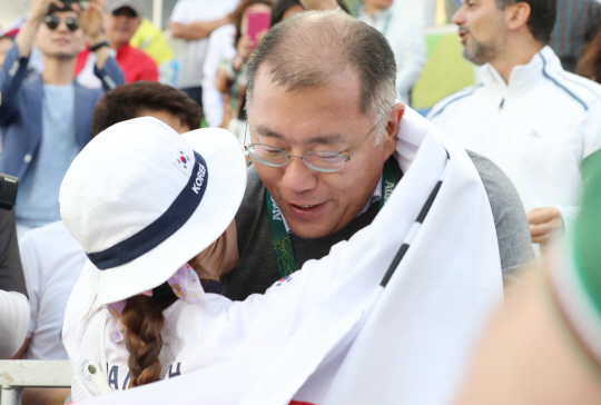 발품도 팔았다. 정 회장은 2일 직접 브라질로 날아와 대표팀의 경기를 모두 지켜봤다. 협회 관계자는 "다른 종목은 회장님이 오면 싫어하는데 우리 선수들은 좋아한다. 세심한 관리로 선수들의 분위기를 올려주신다"고 귀띔했다. 태극기가 휘날리며, 애국가가 4차례 울려퍼진 것은 결코 우연이 아니었다. 선수와 코치진은 '4관왕' 직후 정 회장을 헹가래 치며 감사의 뜻을 표했다.