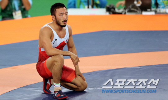 한국 레슬링 대표 류한수가 16일 오전(현지시간) 브라질 리우데자네이루 바하 올림픽파크 카리오카 아레나2에서 열린 2016리우올림픽 레슬링 남자 그레코로만형 66kg급 동메달 결정전에서 아제르바이잔 의 츄나에브 라술에게 패한 뒤 무릎을 꿇고 있다. /2016.8.16/리우데자네이루=올림픽사진공동취재단 k