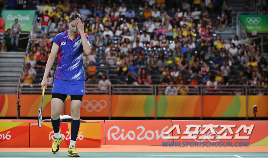 16일 오후(현지시간) 브라질 리우데자네이루 바하 리우센트로 파빌리온 4에서 열린 2016 브라질 리우올림픽 배드민턴 여자단식 8강전에서 한국에 성지현이 스페인에 캐롤리나 마린과 경기 도중 공격이 실패하자 안타까워하고 있다. 2016.8.16/리우데자네이루=올림픽사진공동취재단H