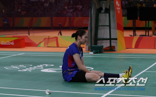 16일 오후(현지시간) 브라질 리우데자네이루 바하 리우센트로 파빌리온 4에서 열린 2016 브라질 리우올림픽 배드민턴 여자단식 8강전에서 한국에 성지현이 스페인에 캐롤리나 마린과 경기에서 패한 뒤 코트 위에 앉아 안타까워하고 있다. 2016.8.16/리우데자네이루=올림픽사진공동취재단H