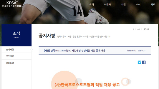 응시원서는 다음달 4일 낮 12시까지 협회 채용 홈페이지(kpsa.saramin.co.kr)를 통해 접수하며, 서류 전형 합격자 발표(9월6일 오후 5시 이후), 인적성 검사(9월7일), 면접(9월9일)을 거쳐 9월12일 최종 합격자를 발표할 예정이다. 채용 관련 자세한 내용은 협회 홈페이지(www.prosports.or.kr)와 채용 홈페이지(kpsa.saramin.co.kr)를 참조하면 된다.