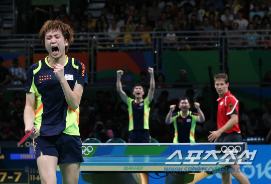 17일 오후(현지시간) 리우데자네이루 파빌리온 경기장에서 남자 탁구 단체 동메달 결정전이 열렸다. 한국의 정영식이 독일 B. STEGER 와 경기를 펼치고있다. 정영식이 승리를 거두고 환호하고있다./2016.8.17/리우데자네이루=올림픽사진공동취재단 D