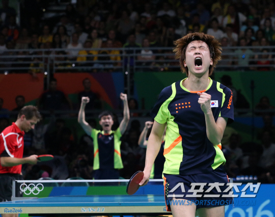 17일 오후(현지시간) 리우데자네이루 파빌리온 경기장에서 남자 탁구 단체 동메달 결정전이 열렸다. 한국의 정영식이 독일 B. STEGER 와 경기를 펼치고있다. 정영식이 승리를 거두고 환호하고있다./2016.8.17/리우데자네이루=올림픽사진공동취재단 D