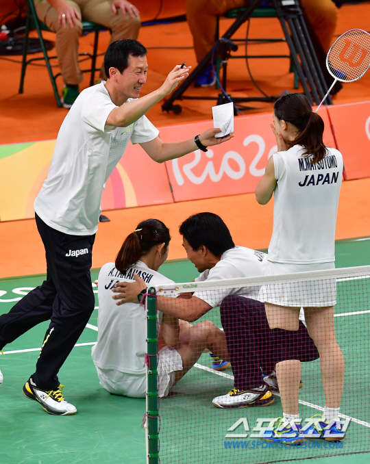 일본 배드민턴 대표팀을 이끄는 박주봉 감독이 18일(현지시간) 브라질 리우데자네이루 리우센트로 파빌리온4 경기장에서 열린 2016 리우올림픽 배드민턴 여자 복식 결승전에서 일본에 마쓰토모 미사키-다카하시 아야카가 덴마크에 크리스티나 페데르센-카밀라 리터 율을 상대로 금메달을 확정지은 뒤 선수들을 격려하고 있다. 박 감독은 일본 여자 배드민턴 대표팀을 세계 최정상 수준으로 끌어올렸다는 평가를 받고 있다. 2016.8.19/리우데자네이루=올림픽사진공동취재단