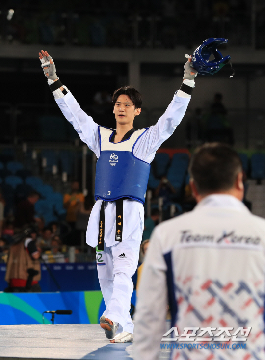 이대훈 선수가 18일 오전(현지시간) 브라질 리우데자네이루 바하 올림픽파크 카리오카 경기장에서 열린 2016리우올림픽 태권도 남자 -68kg급 동메달결정전에서 벨기에 자우드 아찹을 누르고 동메달을 확보하자 손을 들고 환호하고 있다./2016.8.18/리우데자네이루=올림픽사진공동취재단 I