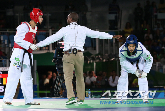 18일 오후(현지시간) 리우데자네이루 카리오카 아레나 경기장에서 태권도 남자 68kg 경기에 출전한 이대훈이 벨기에 자우드 아찹과 동메달 결정전을 펼쳤다. 이대훈이 경기 도중 부상을 입었다. 경기는 이대훈이 승리해 동메달을 획득했다./2016.8.18/리우데자네이루=올림픽사진공동취재단 D