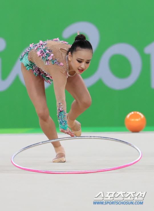 리듬체조 손연재가 19일 오후(현지시간) 2016 리우올림픽 리듬체조 개인종합 예선이 진행된 리우데자네이루 바하 올림픽파크 체조경기장에서 후프 종목 연기 중 후프를 떨어뜨리고 있다./2016.8.19/ 리우데자네이루=올림픽사진공동취재단 I/