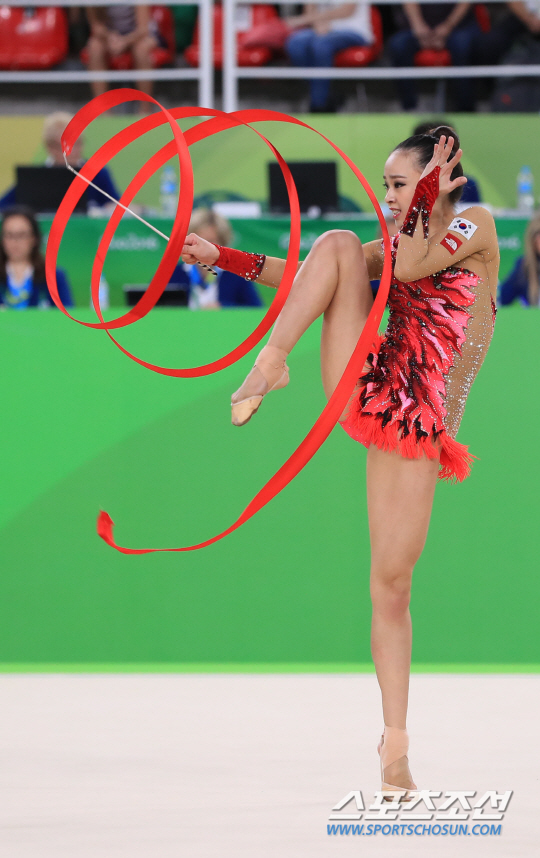 리듬체조 손연재가 19일 오후(현지시간) 2016 리우올림픽 리듬체조 개인종합 예선이 진행된 리우데자네이루 바하 올림픽파크 체조경기장에서 리본 종목 연기를 펼치고 있다./2016.8.19/ 리우데자네이루=올림픽사진공동취재단 I/