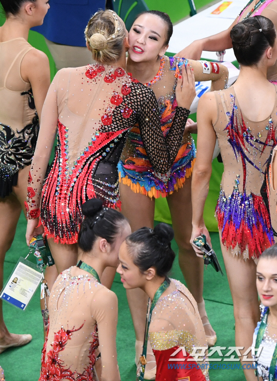 손연재가 19일 오후(현지시간) 브라질 리우데자네이루 바하 리우올림픽 경기장에서 열린 리듬체조 예선전에서 5위를 기록하며 결선에 진출했다. 경기를 마친 선수들과 인사를 나누는 손연재의 모습./2016.8.19/리우데자네이루=올림픽사진공동취재단 N