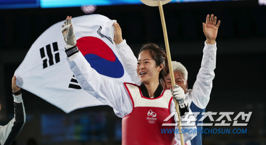 태권도 한국대표 오혜리 선수가 19일 오후(현지시간) 브라질 리우데자네이루 바하 올림픽파크 카리오카 경기장에서 열린 2016리우올림픽 태권도 여자 -67kg급 결승전에서 프랑스의 하비 니아레와 맞대결에서 금메달을 확정하고 환호하고 있다. 2016.8.18/리우데자네이루=올림픽사진공동취재단 G