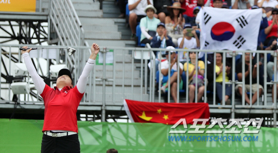 박인비가 20일 오후(현지시간) 브라질 리우데자네이루 올림픽 골프코스에서 열린 리우올림픽 여자 골프 개인전 최종라운드에서 우승한 뒤 환호하고 있다. 2016.8.20/올림픽사진공동취재단