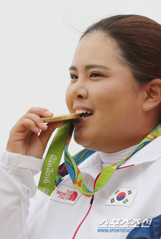 여자골프 박인비가 20일 (현지시간) 브라질 리우데자네이루 올림픽 골프코스에서 열린 2016 리우올림픽 여자골프 파이널 라운드에서 우승한뒤 금메달을 깨물어보고 있다/2016.8.20/리우데자네이루=올림픽사진공동취재단
