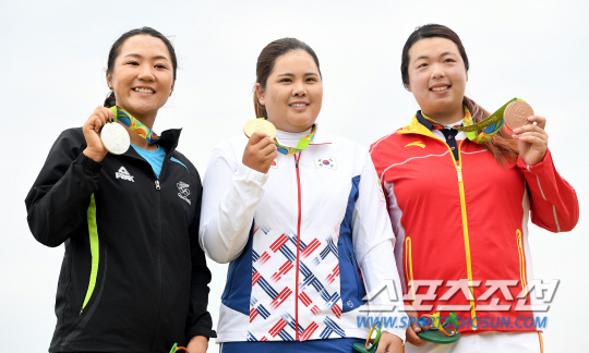 박인비 선수가 20일(현지시각) 브라질 리우데자네이루 바하 올림픽 골프코스에서 열린 여자골프 마지막 4라운드에서 우승 금메달을 목에걸고 기뻐하고 있다 ./2016.8.20/리우데자네이루=올림픽사진공동취재단