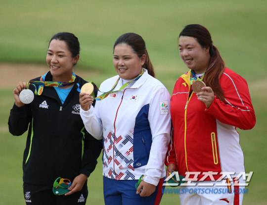 박인비가 20일 오후(현지시간) 브라질 리우데자네이루 올림픽 골프경기장에서 열린 여자 골프 4라운드 경기에서 금메달을 차지했다. 박인비가 시상식장에서 금메달을 들어보이고 있다 .2016.8.20/리우데자네이루=올림픽사진공동취재단