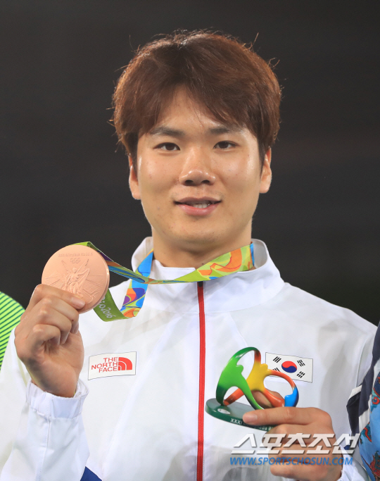 한국 태권도 대표 차동민 선수가 20일 오후(현지시간) 브라질 리우데자네이루 바하 올림픽파크 카리오카 경기장에서 열린 2016리우올림픽 태권도 남자 +80kg급에서 동메달을 획득, 시상식장에서 메달을 들고 포즈를 취하고 있다./2016.8.20/리우데자네이루=올림픽사진공동취재단 I