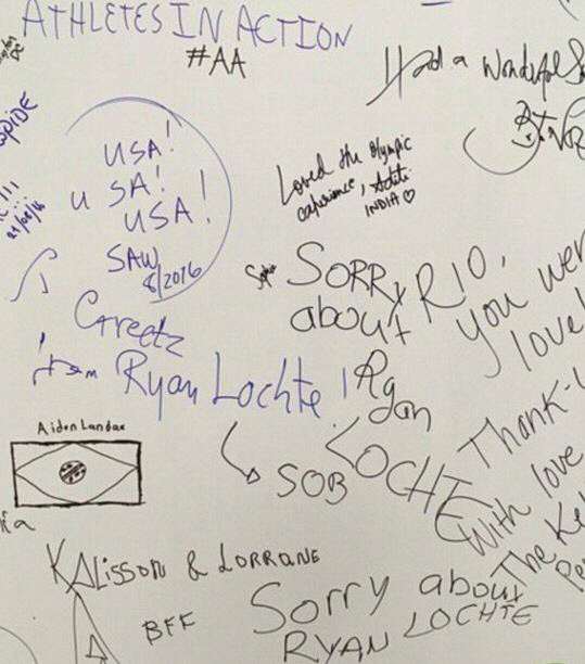 부끄러움은 미국 국민의 몫이었다. 리우를 떠나는 미국민들은 리우공항 화이트보드에 사과문을 남기기 시작했다. 보드 한면이 '쏘리 어바웃 록티(Sorrry about Lochte)'로 가득 찼다.