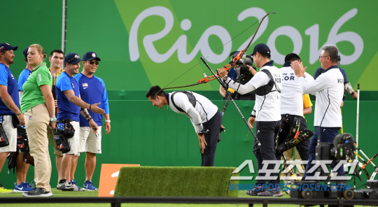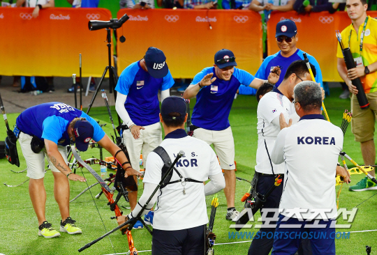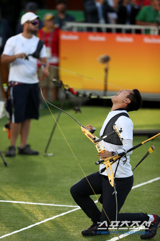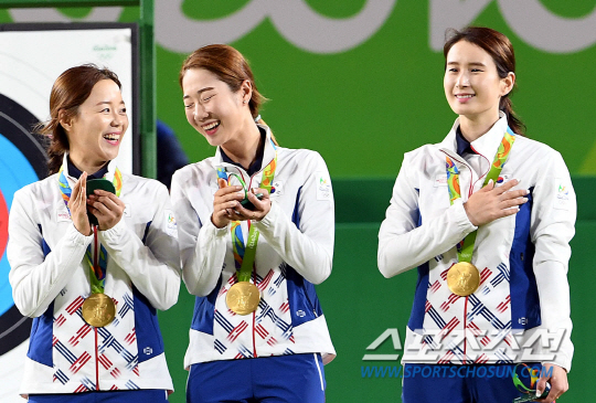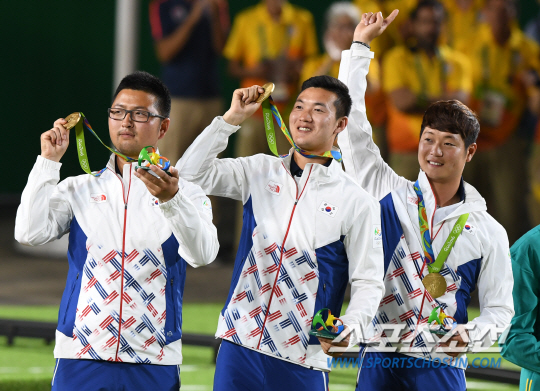 7일 새벽 남장양궁단체전에서 구본찬,김우진, 이승윤이 한국 선수단에 첫 금메달을 안겨줬다. 8년 만의 남자단체전 금메달이었다. 그리고 양궁 전종목 석권의 서막이었다.