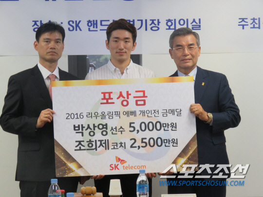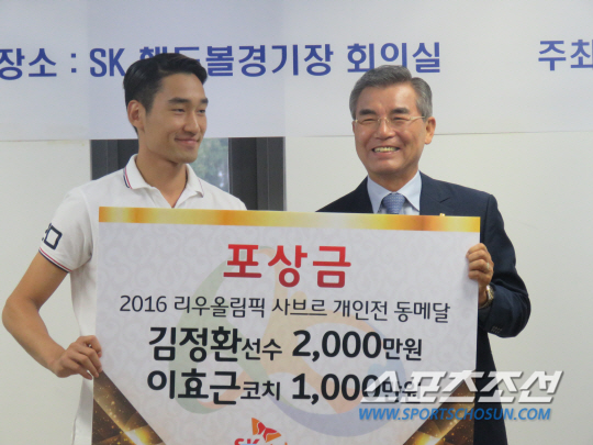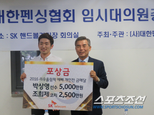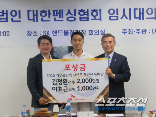 대한펜싱협회 회장사 SK텔레콤이 리우올림픽에서 국민들에게 큰 감동을 안긴 '투혼의 펜서' 박상영(21·한체대)과 김정환 (33·국민체육진흥공단)에게 두둑한 메달 포상금을 지급했다.