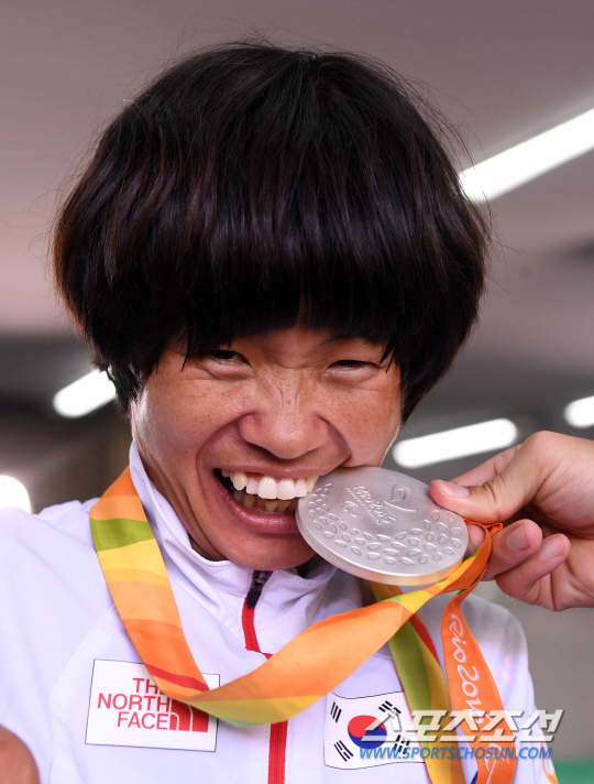 전민재가 시상식후 지인의 도움을 받으며 은메달을 깨물고 있다.