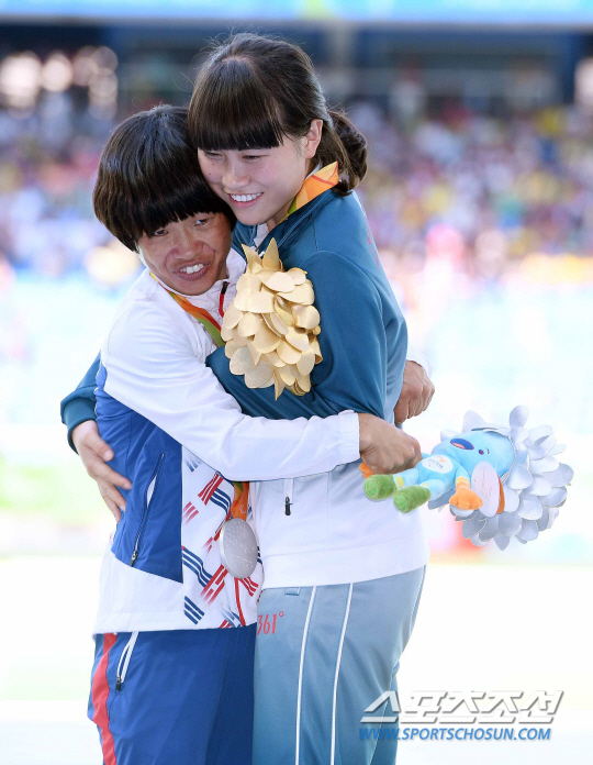 전민재가 시상식에서 금메달을 딴 중국의 SHI Yiting과 껴안고 기쁨을 나누고 있다.