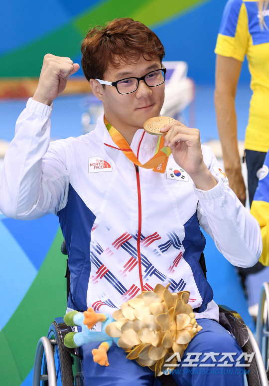 조기성이 시상식에서 금메달을 깨물며 기뻐하고 있다. 조기성은 39초 30으로 터치패드를 끓으며 우승, 100m와 200m에서 금메달을 따낸 데 이어 이날 금메달을 추가함으로써 한국 패럴림픽 수영사상 최초의 3관왕이 되었다.선천적 뇌병변 장애로 장애를 겪고 있는 조기성은 2008년 재활을 목표로 수영에 입문, 천부적인 실력이 발현되며 한국 수영의 간판선수가 됐다.