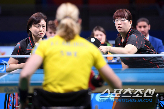 [리우패럴림픽] 17일(한국시간) 오후 10시 브라질 리우데자네이루 리우센트루 3관에서 탁구 여자단체전 3,4위 결정전 한국과 스웨덴의 경기가 열렸다. 경기결과 한국이 스웨덴을 세트스코어 2-1로 물리치고 동메달을 획득했다. 복식경기에서 정영아가 스웨덴 선수에게 강스매싱을 매기고 있다.