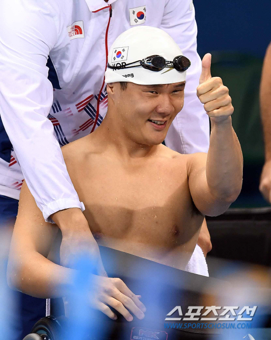 [리우패럴림픽] 18일(한국시간) 오전 6시 한국의 조기성이 브라질 리우데자네이루 올림픽파크내 수영장에서 벌어진 S4 남자 50m 자유형에서 우승, 금메달을 목에 걸었다. 조기성이 1위로 들어 온 후 한국 응원단의 호응에 엄지로 답하고 있다.