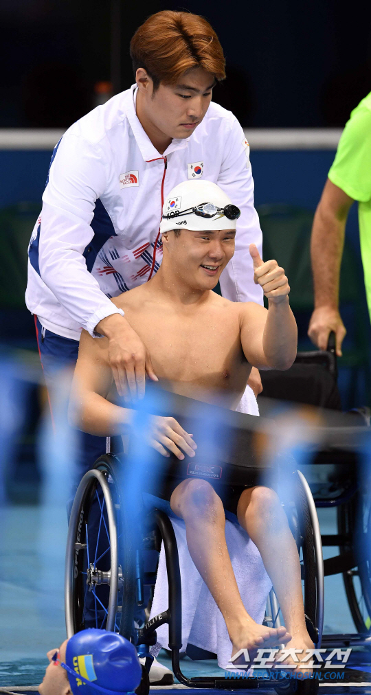 [리우패럴림픽] 18일(한국시간) 오전 6시 한국의 조기성이 브라질 리우데자네이루 올림픽파크내 수영장에서 벌어진 S4 남자 50m 자유형에서 우승, 금메달을 목에 걸었다.조기성이 1위로 들어 온 후 한국 응원단의 호응에 엄지로 답하고 있다.