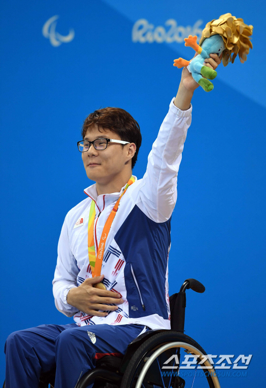[리우패럴림픽] 18일(한국시간) 오전 6시 한국의 조기성이 브라질 리우데자네이루 올림픽파크내 수영장에서 벌어진 S4 남자 50m 자유형에서 우승, 금메달을 목에 걸었다. 조기성이 시상식에서 금메달을 목에 걸고 기뻐하고 있다.