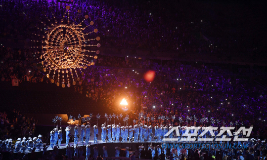 성화가 그라운드로 내려오며 꺼지고 있다.